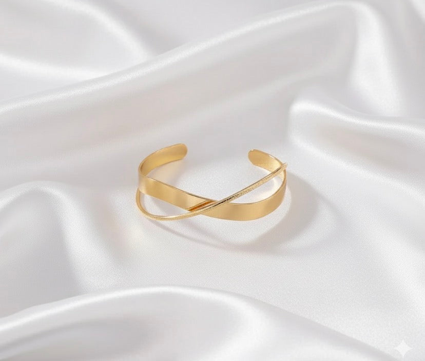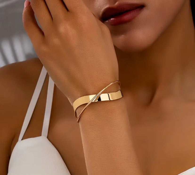 “A bold statement of golden elegance, this bracelet combines sleek design with a polished shine. Lightweight and versatile, it adds a touch of luxury to any outfit.”