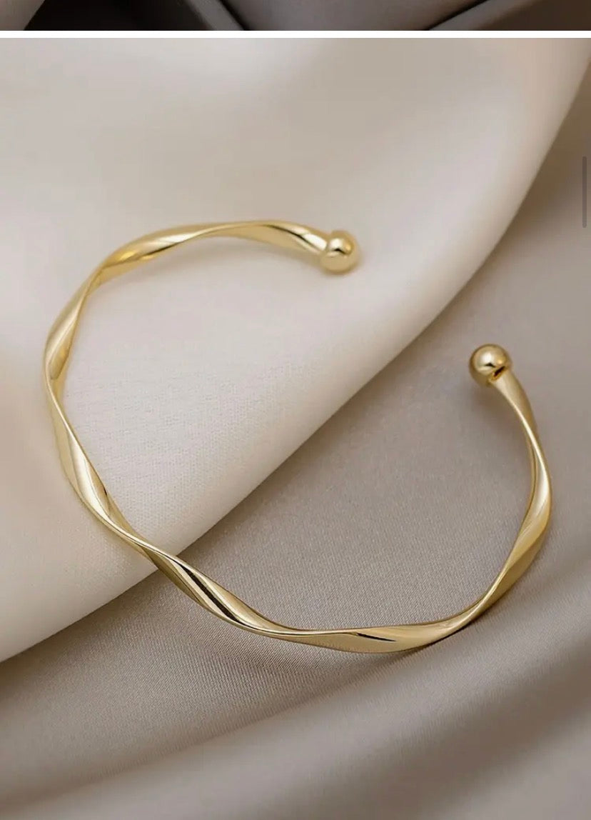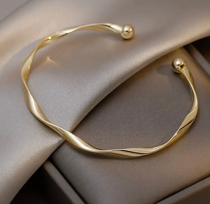 A sleek golden cuff that blends minimal elegance with bold texture. Its fine, harsh grooves reflect light beautifully, making it a statement of effortless confidence.